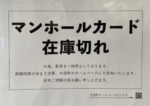 在庫状況 ● 在庫:なし※ 次回入荷予定時期は未定となります。配布再開時期が決まり次第、こちらに掲出いたします。 マンホールカード配布場所 ● 大洗町観光情報交...