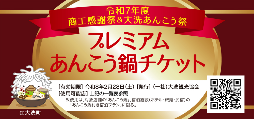 11月15日(土)・16日(日)の2日間、商工感謝祭&大洗あんこう祭の会場で『大洗町内のあんこう鍋を提供するお店(以下の表をご参照ください)で使える5,000円分の商品券』4,000円で販売します。午前9時30分より販売開始、1日限定150冊販売。
